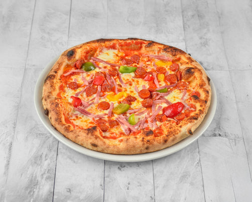 Sauce tomate, Mozzarella, Jambon d'épaule, Merguez, Poivrons, Origan