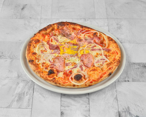 Sauce tomate, Mozzarella, Jambon d'épaule, Saindoux, Oignons, Oeuf, Origan
