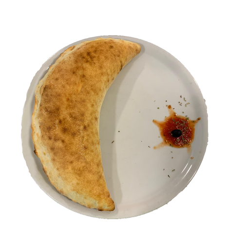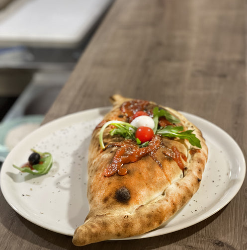 Pizza pliée avec de la Sauce tomate, Mozzarella, Jambon d'épaule, Champignons, Oeuf, Origan