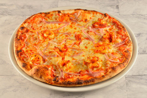 Sauce tomate, Mozzarella, Jambon de la région, Crevettes, Ail