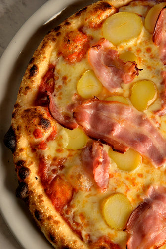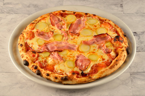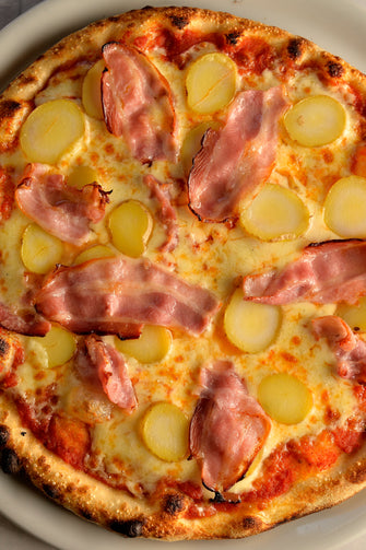Découvrez notre pizza Raclette, une création gourmande inspirée de la tradition suisse. Garnie généreusement de fromage à raclette fondant, de pommes de terre tendres, de lard croustillant et d'ail parfumé, cette pizza vous offre toute la convivialité d'une raclette traditionnelle dans une version originale et savoureuse.